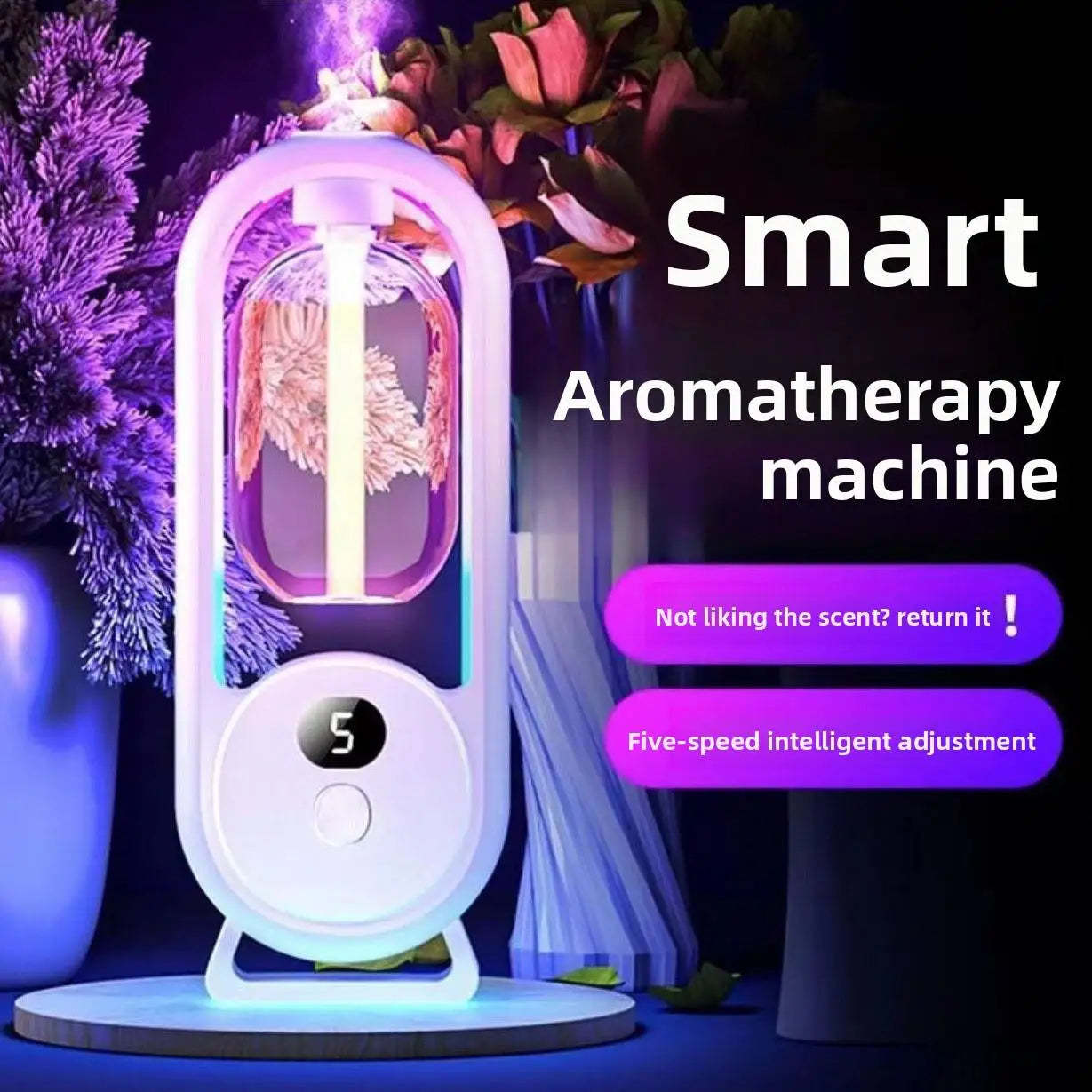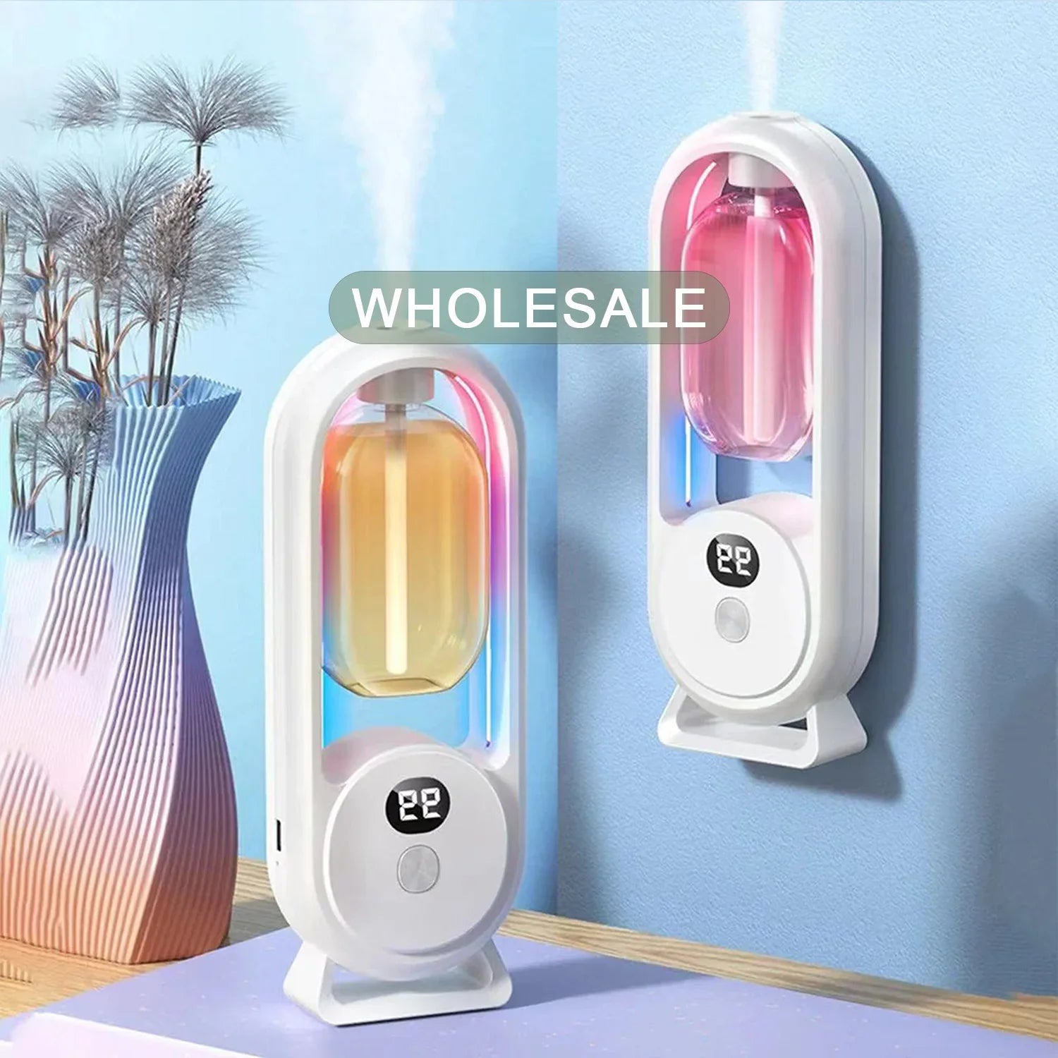 Ce diffuseur automatique combine technologie d’atomisation continue, design lumineux LED et double utilisation murale ou sur table, exactement comme sur l’image.